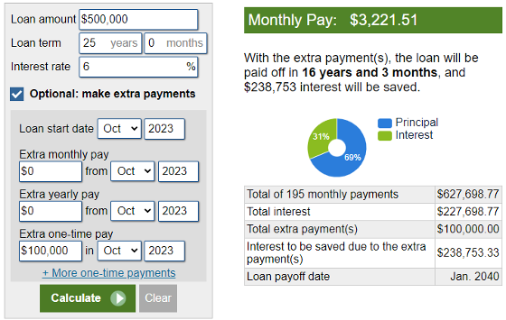 • One-Time Significant Payment: If you can manage it, making a one-time payment of $100K can be a game-changer. This strategy could save you a whopping $238K in interest, allowing you to clear your mortgage in just 16 years.