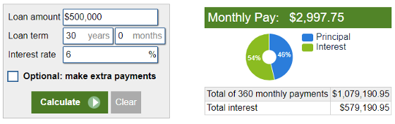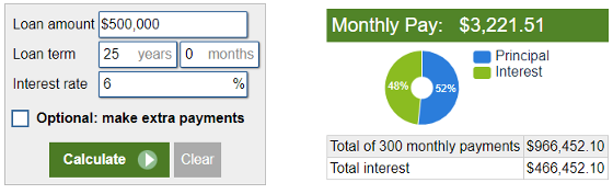 Imagine you have a remaining mortgage loan amount of $500K, with an interest rate of 6% and an amortization period of 25 years. Over this term, you'd end up paying approximately $466K in interest alone.